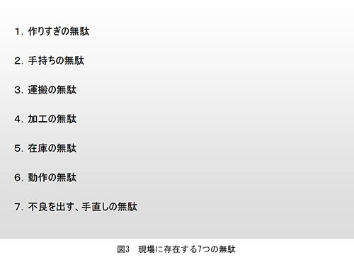 現場には全部で7つの無駄があるが(図3)、これから特に注意が必要な無駄について説明を行っていくので、一つ一つの無駄について、確実に理解しておいていただきたい。