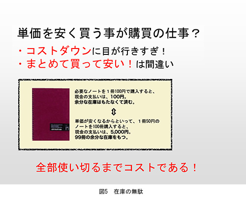 同じ発想で、よく行われるのが「資材・購買部門」の発注の仕方に現れる。図5を見ていただきたい。たくさん買うことで仕入れ単価を小さくし、「自分は完璧な仕事をした!」と満足していないだろうか? これは、逆に考えてみれば簡単にわかることなのである。