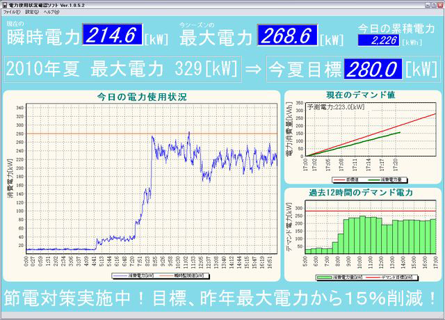 おそらく原発事故の後の『節電・省エネ』ムードや、電力会社からの『節電のお願い』が大きく影響しているとは思うが、会社としても『最大電力を昨年夏に比べて15%削減する』という方針を示したことと、『見える化』することによって自分たちがどのような行動を取ればデマンドを抑えられるかが全社で共有できたことが大きかったと考える。