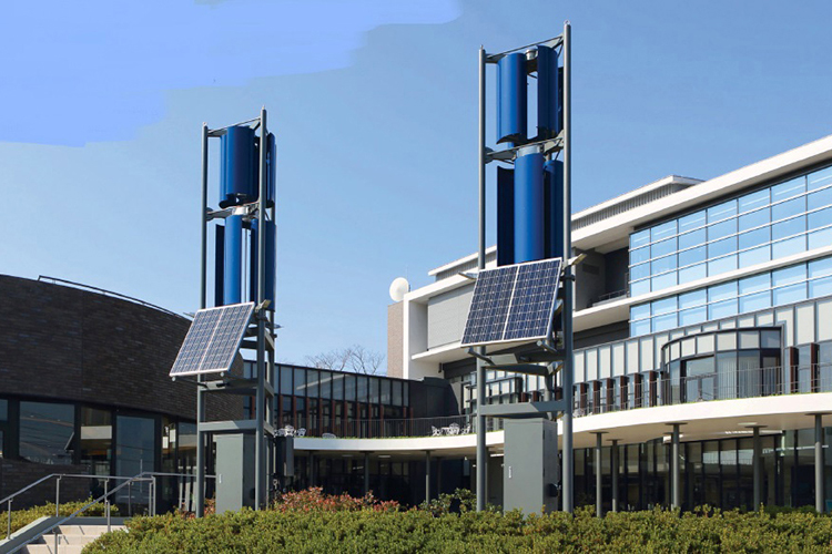 設置面積が少なく、ビルの屋上や険しい山間部に設置可能なトルネードタービンブレード風力発電装置。特徴は、①騒音やバードストライクがないため、近隣住民や動物にやさしい、②日本の厳しい気候条件にマッチし、頑丈な三角フレーム外構造により破損が少ない、③ピッチコントロール、ヨー動作がないため、部品が少なく故障が少ない、④静止時に電力を使わない、⑤シンプルな構造で影のちらつきが少ない、⑥カットアウトがないため、風速による使用領域が多い、など。