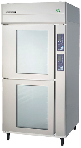 ノンフロン冷媒採用のドゥコンディショナ。特徴は、①地球温暖化係数(GWP)が極めて低いノンフロン冷媒R1234yf(GWP:1)を採用、②独自のマイクロチャンネル凝縮器により、冷媒封入量の大幅削減を実現、③高い温湿度制御技術により、ベーカリー市場の多様なニーズに応え、環境負荷の低減にも貢献、④電源:三相200V、⑤冷媒ガス漏れ10年保証、⑥外形寸法:W900×D1014×H1904mm、⑦有効内容量:上室362ℓ/下室362ℓ、⑧収容能力:6取天板またはフランス天板36枚(18枚×2室)、⑨東南アジア/台湾向け製品も用意、など。