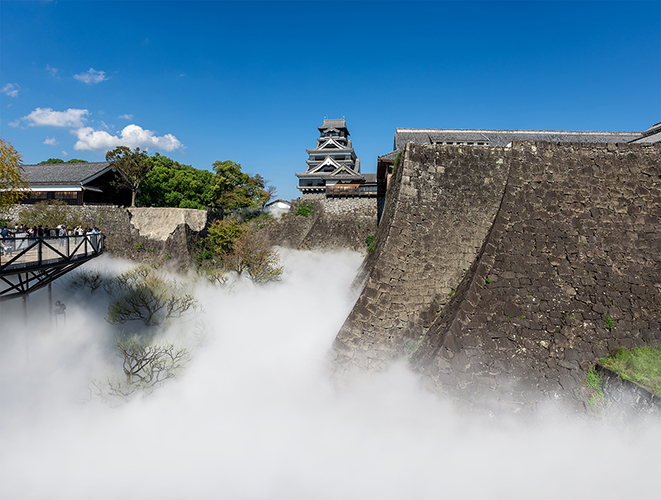 自然現象の雲海を人工的に作り出す人工雲海システム。特徴は、①ドライフォグ技術を応用して微細な霧を噴霧し、屋外空間に人工の雲海を発生させる、②空間規模や目的に合わせて機器選定、レイアウト設計を実施、③庭園/神社仏閣/城郭/スタジアム/テーマパーク/レジャー施設など幅広い場所での導入実績、④夏の暑さ対策としての利用も可能、⑤ミスト噴霧用高圧ポンプやセンサ類、タイマ類、制御装置などで構成、など。