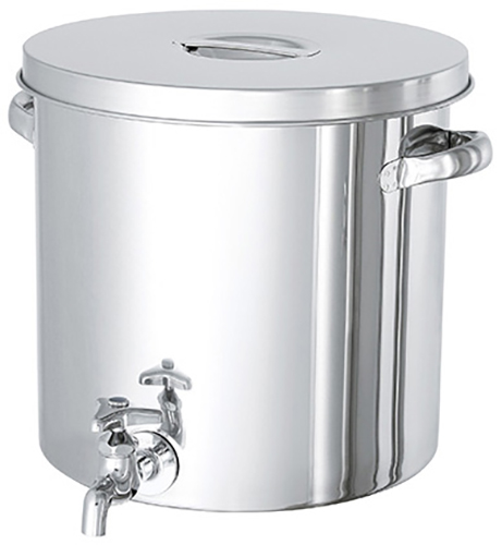 スタンダードな蛇口が付いた蛇口付汎用容器。特徴は、①欲しいときに蛇口をひねるだけで給水できるウォータージャグタイプのステンレスタンク、②液体を小分けしたい時に便利、③かぶせ蓋付き、④容器/蓋:SUS304、ロックナット:黄銅、横水栓(蛇口):呼び13/青銅+めっき、Oリング:NBR、⑤表面処理:内外面バフ研磨、⑥使用条件:大気圧(加減圧不可)、など。