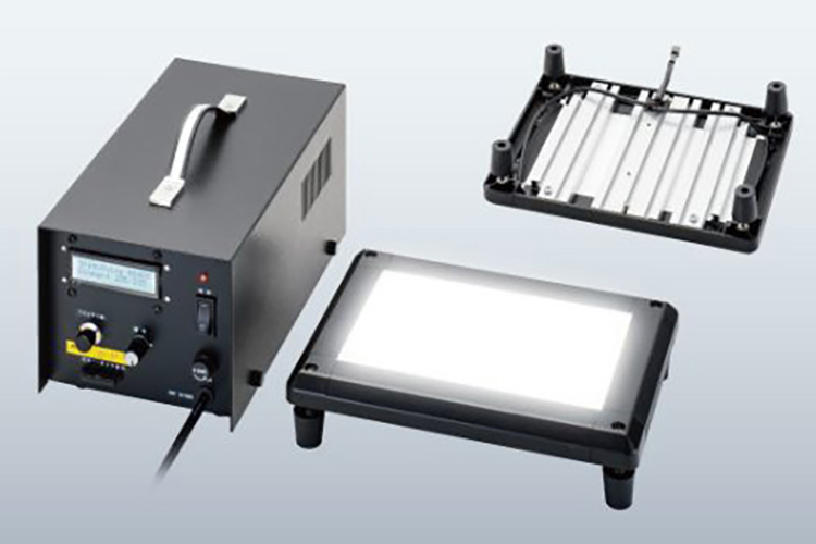 薄型で均一発光を実現した高出力フラットパネル照明。特徴は、①長寿命50000時間、②サイズ:長さ160〜1800mm/幅100〜900mm/高さ20mm、③LED:1波長実装、④波長(実装例):6500K(昼光色)、⑤LED電流:max1.4A(常時点灯)/max2.0A(パルス点灯)、⑥直下照度:50000lx@WD100mm、⑦外部信号(デジタル/アナログ)制御、大型ヒートシンク搭載、など。