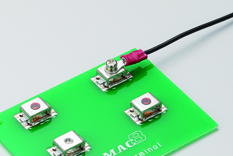 プリント基板へ電源を供給するための線材を取り付けることができる表面実装用電源端子。特徴は、①チップマウンタに対応、②電流40Aに対応し基板への固定面積...