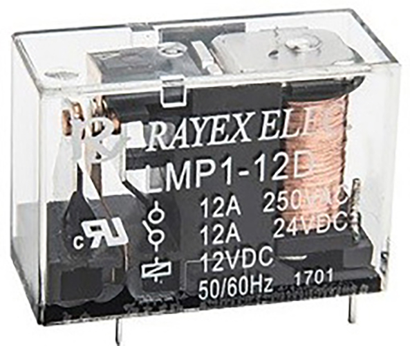 台湾のRAYEX ELECTRONICS社製で、接点容量12Aのプリント基板実装タイプのPC実装ミニチュアリレー。特徴は、①家電/電子レンジ/エアコン/音響機器/温度コントローラに最適、②1回路C接点(1PDT)、③接点容量:12A(AC250V/DC30V)抵抗負荷、④リレー高さ:20.5mm、透明ケース、⑤高感度コイル:0.53A DC、⑥絶縁耐力:AC5000V、絶縁距離:8mm、⑦ULファイル番号:E131959、CULファイル番号:E131959、など。