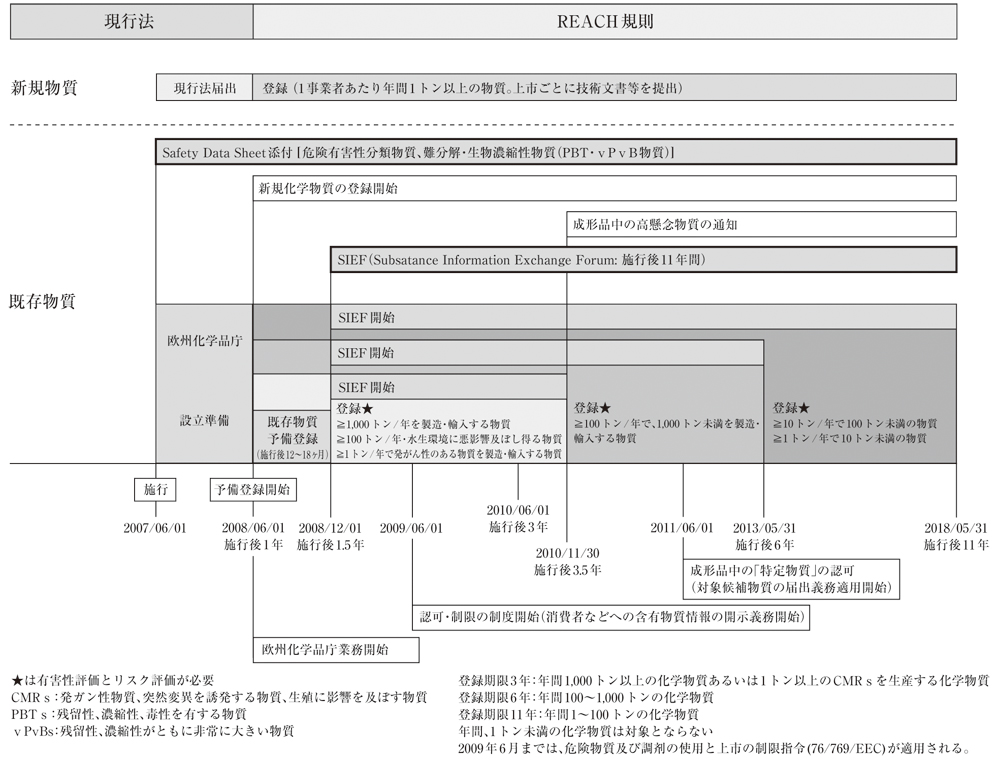 年間の製造または輸入量が1トン以上の化学物質が対象で、図1に示すように予備登録が2008年12月1日で終了し、さらに第一段の本登録の締め切りが2010年11月30日に終了、第二段の本登録の締め切りが2013年5月31日と迫り、2018年までを最終期限として段階的に実施される規則である。