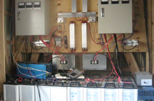 その24ボルトの電気をインバーターで交流100ボルトに変換し小屋の電力源として使い、余剰電力はバッテリーに貯え電気使用量の多い時に備えている(写真2?4)。