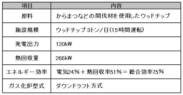 バイオマスなど未活用エネルギー実証試験事業として葛巻町では、『森林の間伐施行に伴う木質バイオマスガス化熱電併給システム』として月島機械株式会社、(独)新エネルギー・産業技術総合開発機構、葛巻町が協力して開始した。主な概要は以下の通りである(表3)15)。
