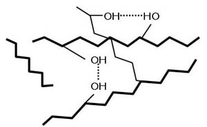 ソルダペーストは、高比重(SnベースPbフリー:7.4g/cm3)のはんだ粉と低比重(1g/cm3程度)のフラックスを混合しており、そのままでは粒が沈降する。そこで、フラックスをゲル状にして沈降を防止する必要があり、ゲル化剤としてワックスが添加された。身近な例では、てんぷら油の処理剤を考えるとわかりやすい。80℃以上で油に処理剤を添加した時は液状だが、冷えるとゲル状になり廃棄することができる。これと同様の状態にして、はんだ粉の沈降を防止するためにチキソ剤が添加される。ゲル化の機構は長鎖の脂肪酸などに付加した−OH(水酸基)の水素結合により強化されると考えられる(図5)。
