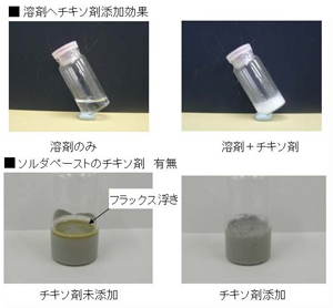 図6にチキソ剤有無の状態を示す。溶剤にチキソ剤を添加するだけで白濁し流動性がなくなっており、チキソ剤を添加していないソルダペーストではフラックスが分離している。
