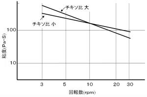 ソルダペーストを撹拌する時、初めは撹拌するのに大きな力が必要だが、撹拌速度を上げると軽い力で撹拌できるようになる現象をチキソ性と呼ぶ。粘度計の測定では、回転数と粘度のデータから得られる傾きから、チキソ性の程度を表す指数となるチキソ比を求める。図7に、ソルダペーストの測定事例を示す。チキソ比が高く傾きが大きいほどチキソ性は強いことになる。