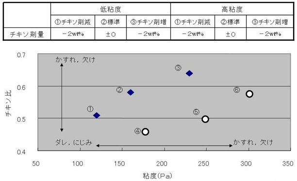 粘度、チキソ比は、印刷性の重要な指標ではあるが、この指標だけで判断する事は難しい。現状ではこれらの指標を参考に、実際に印刷して評価することが必要であろう。