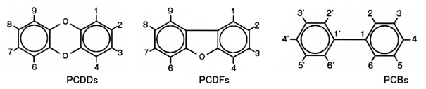 ダイオキシンという物質は実は存在せず、正式にはダイオキシン類と表現すべきであり、図2に示すポリ塩化ジベンゾ−p−ジオキシン(PCDD 75種の異性体)、ポリ塩化ジベンゾフラン(PCDF1 35種の異性体)、コプラナーポリ塩化ビフェニル(co−PCB)の1、4−ジオキシンの総称である。この内、2,3,7,8、−四塩化ジベンゾパラダイオキシン(TCDD)はもっとも毒性が強く、青酸カリの1万倍の毒性があるといわれている。しかし、ダイオキシン類の中には、毒性の弱いものもあり、2,3,7,8、−四塩化ジベンゾパラダイオキシンの毒性の強さを1とした時のおのおのの異性体の毒性の強さを毒性等価係数(TEQ)で表している。