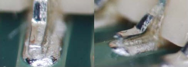 図4は、本部品のリードはぬれず、はんだの上に浮いた状態になっている。温度プロファイルをチェックしたが特に問題はない。調査すると、本部品は『流通品』を使用していることが判明した。『流通品』は部品メーカーで製造後の、部品商社間での流通・保管履歴が不明であるため、活性力の弱いフラックスではリード表面の金属酸化膜を完全に除去できなかったものと思われる。