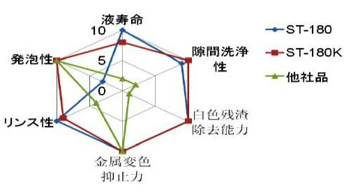 以上の洗浄を実施するために開発された製品としては、荒川化学(株)製のパインアルファ(『ST-180』『ST-180K』)があり、すぐれた洗浄能力をもつ洗浄剤である。