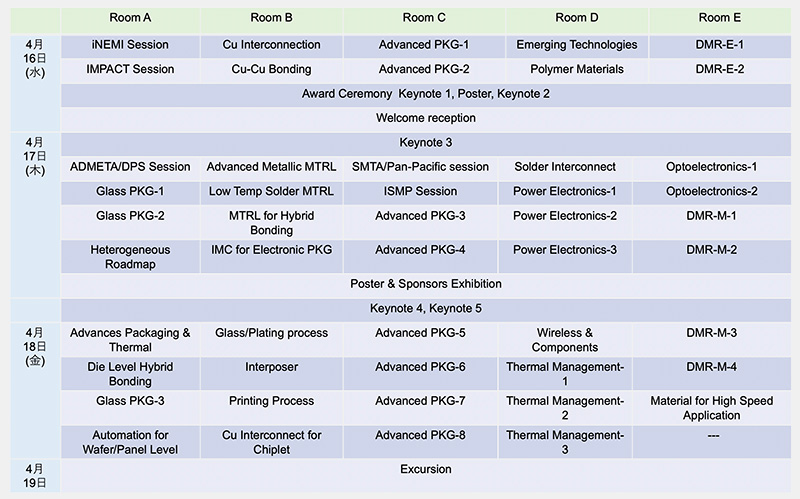 カテゴリ毎に分かれた計49の各技術セッションは、3日間5パラレル進行し、特別セッション:iNEMI、IMPACT(Taiwan)、ADMETAドライプロセスシンポジウムDPS、SMTA/Pan Pacific、 ISMP(Korea), Glass PKGも開催された(表2)(写真6)。