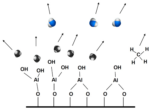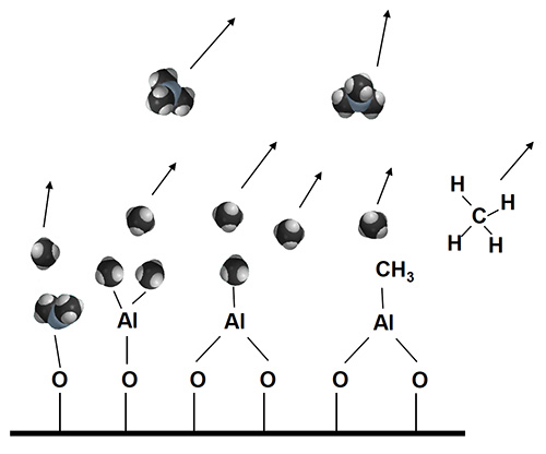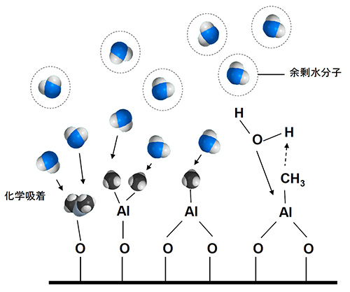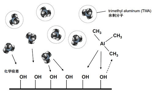 1.TMA(Trimetyl Aluminium、(CH3)3Al)分子が基板表面の-OH基と反応・吸着