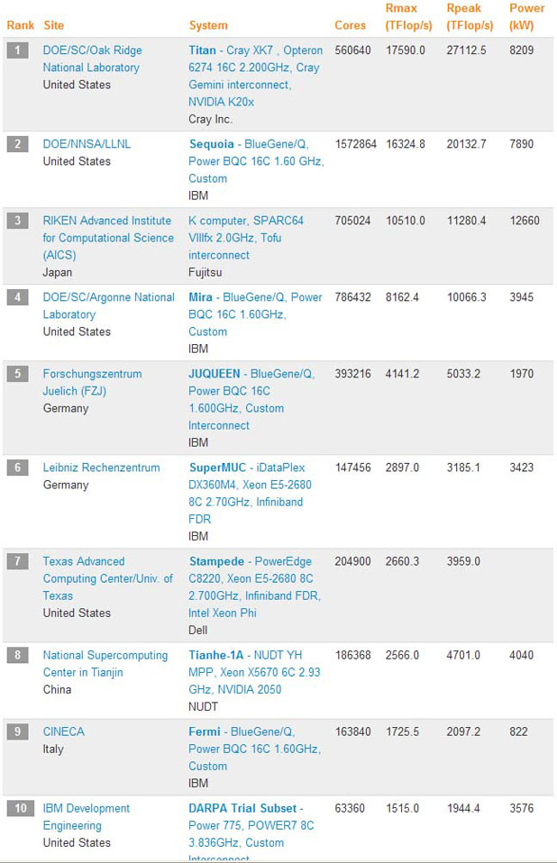 2012年11月に『京』を抜いて性能トップと2位になったシステムの消費電力は『京』の2/3程度です。TOP10の中ではもっとも電力効率はよくありません(表1)。