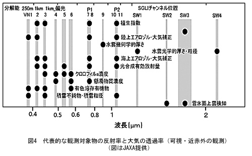 積んでいる観測機器は、「可視・近赤外放射計(VNR)」と「赤外走査放射計(IRS)」で、広い波長域(380nm ~12μm)をカバーし、衛星直下で約1㎞~250mの空間分解能をもっている。地上からの反射光の波長によって何が観測されるかを図4に示す。