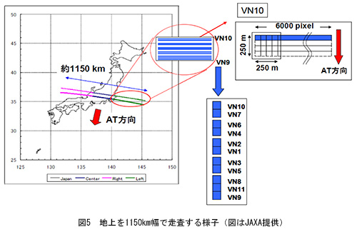 「可視・近赤外放射計(VNR)」では、偏光観測2本と非偏光観測3本の鏡筒が搭載されており、図5は地上を走査する様子で、1150km 幅の画像を6000画素で撮影している。