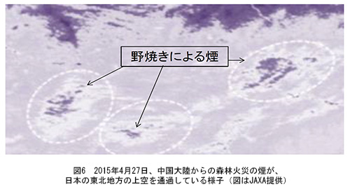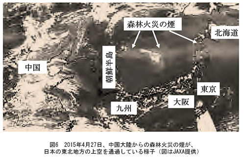 図6は、過去の観測衛星によるものだが、中国で発生した森林火災による煙が、日本の東北地方へ流れてきた様子を明瞭にとらえた写真である。