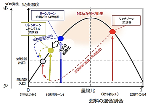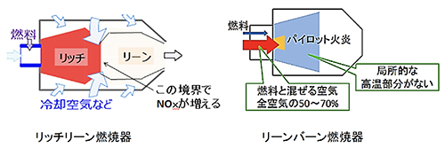 リーンバーン燃焼器では燃料ガスと空気を混ぜた後に燃焼するので、燃料リッチな部分がなくて高温にならず、NOxの発生が抑えられる。