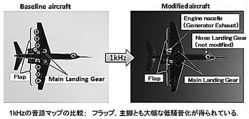 図5は、実際の飛行試験の際に測定した騒音を可視化した図で、フラップや主脚などの低騒音化の効果がわかる。
