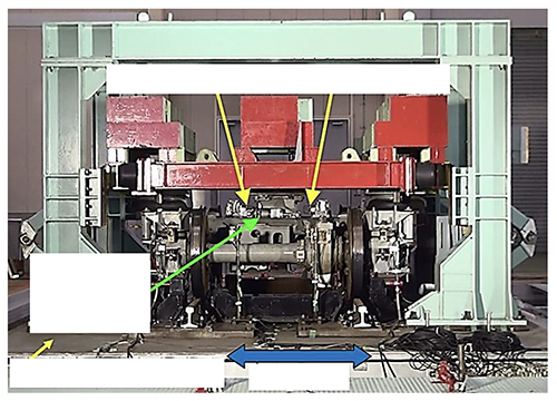 大型振動試験装置による実台車加振試験(図6)の結果、地震対策ダンパを装備した場合には、現行のダンパを装備した場合に比べ、大きな加振振幅まで輪重がゼロにならない(=車輪が飛び上がらない)ことが分かり、脱線に対する安全性が向上することが確認された。