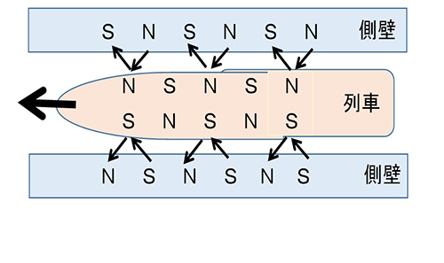 リニアモーターカーが進行すると、側壁に設置されているコイルに電流が流れ磁場が発生する。
