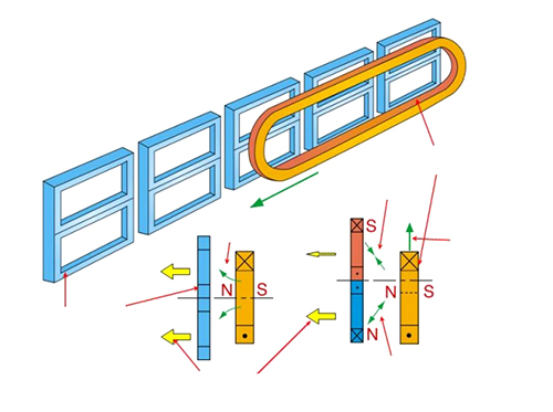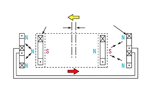 その結果、近づいた側のコイルと超電導磁石との間に反発力、遠ざかった側のコイルとの間には吸引力が発生して、超電導磁石を中央に押し戻す。