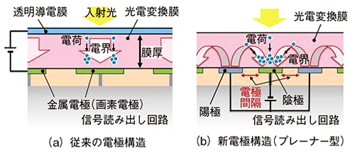 膜内の電界をさらに強めるためには増倍膜の厚みを薄くする必要があるが、従来構造では印加できる電圧には制限があり、膜厚が薄くなるほど光の吸収が低下し、光の利用効率低下を招く。