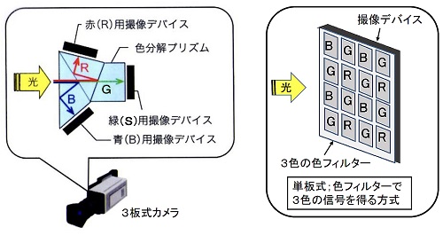 イメージセンサの信号から色信号を得るには、図10左のように入射光をプリズムで赤(R)、緑(G)、青(B)に分解してそれぞれを3個のイメージセンサで読み出す3板式と、図10右のようにイメージセンサの前にRGBの色フィルタを貼り付けるべイヤー式といわれる方法が一般的である。