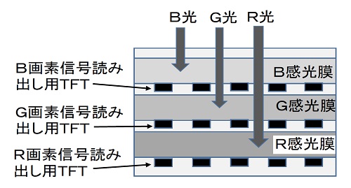 本デバイスは、RGBのそれぞれに感度を持つ有機光電変換膜(有機膜)と、各有機膜で発生した信号を読み出す薄膜トランジスター(TFT)アレイとを交互に積層したものである。