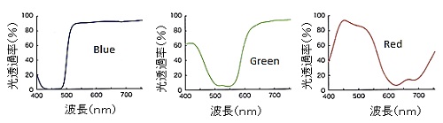 GとRを透過するには、Bの補色のイエロー(黄色)の膜となり、Gの補色はマゼンタ(赤紫)、Rの補色はシアン(水色)の有機膜が用いられる。