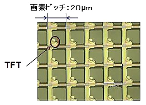 TFTアレイの画素ピッチも、従来の50μmから20μmに微細化することができ(図14)、128×96画素のB用有機膜撮像デバイスを試作した。