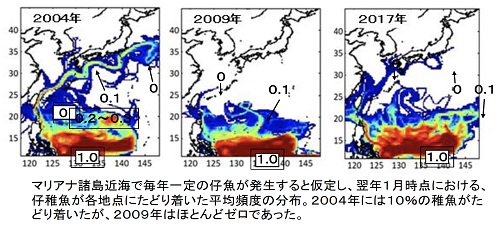 また、他の研究によって、年々の変動は、北赤道海流が存在する緯度の南北移動が加入量の変動に影響を与えることや東シナ海の黒潮流速が遅くなっていることも示されており、物理的にみて仔稚魚が日本や台湾に来遊しにくい傾向になっていると解釈された(図7)。