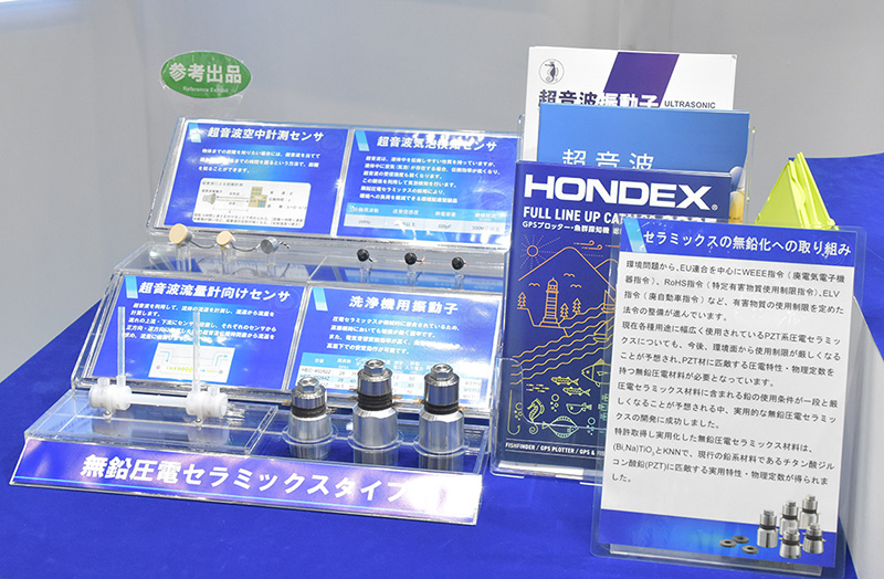 本多電子(株)は、参考出品として無鉛圧電セラミックスタイプの『超音波空中計測センサ』『超音波気泡検知センサ』『超音波流量計向けセンサ』『洗浄器用振動子』の展示を行っていた。
