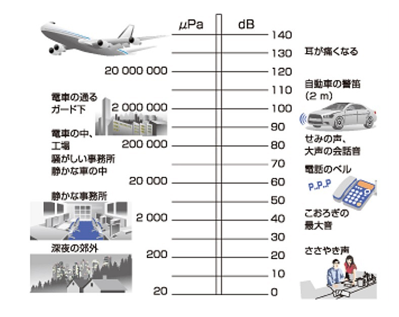 人間の聞くことのできる音圧は20 [µPa(10-6Pa)]から200 [Pa]と1000万倍にもなる。