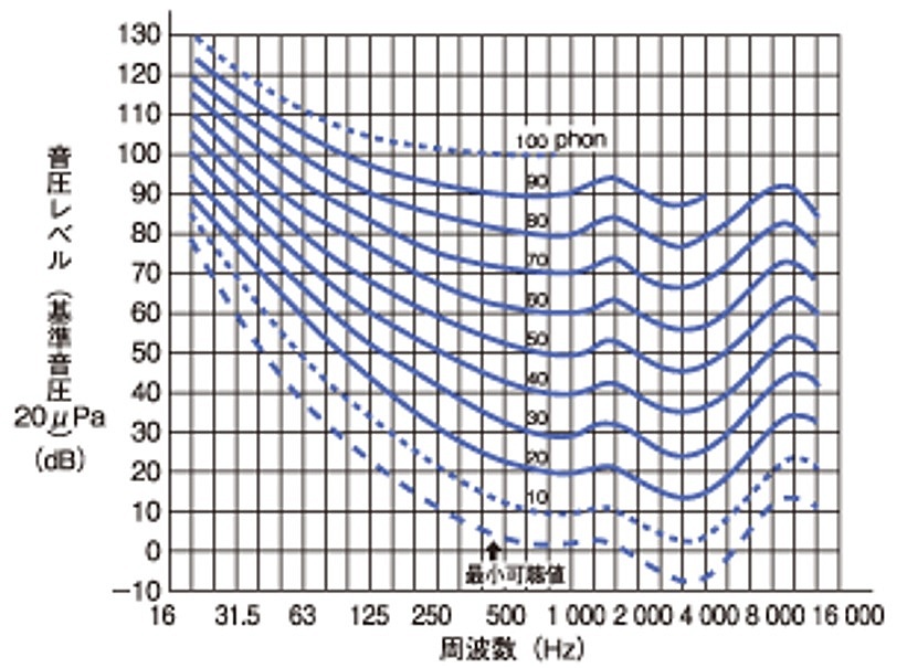 図5は純音の音の大きさのレベルと周波数の関係を示しており、この曲線を等感曲線(isosensitive curve)という。