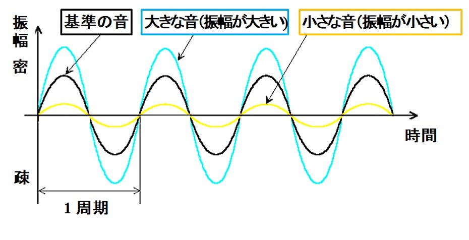 ①については、図6に示すように音を振動の面で見た場合、同一の周期の条件下で、音の大きさが大きいのは振幅が大きく、逆に小さいのは振幅が小さい。