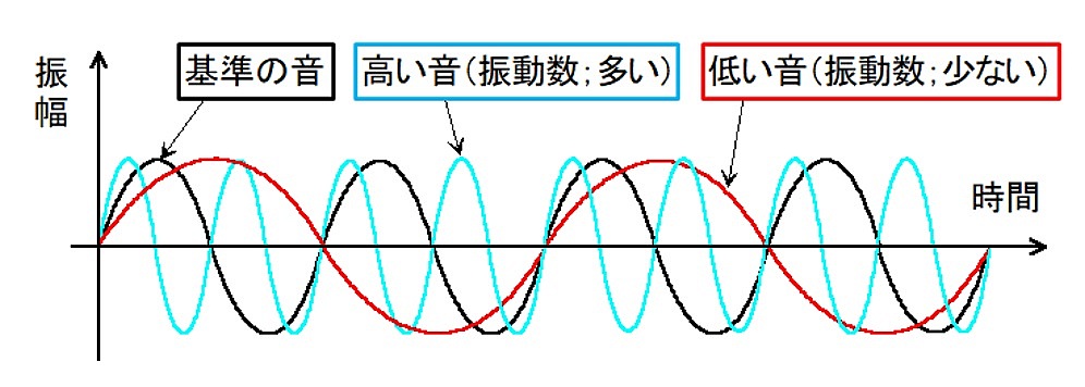 ②の音の高さとは、図7に示すように同一の振幅の条件下で、1秒あたりのくり返し回数を示す周波数(振動数)で表され、高い音は周波数が高く(振動数が多い) 低い音は周波数が低く(振動数が少ない)なる。