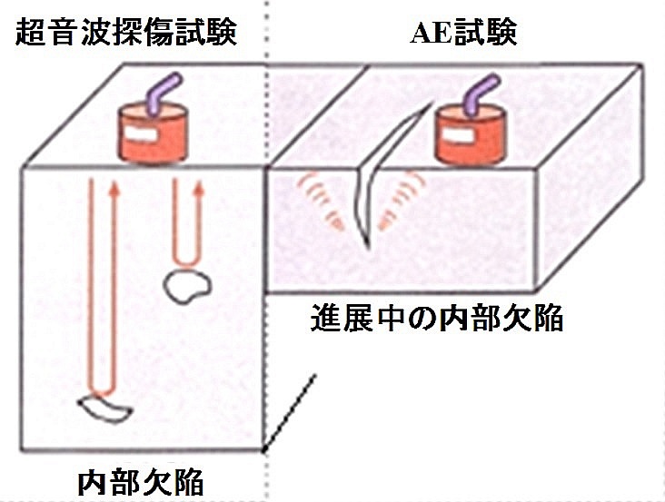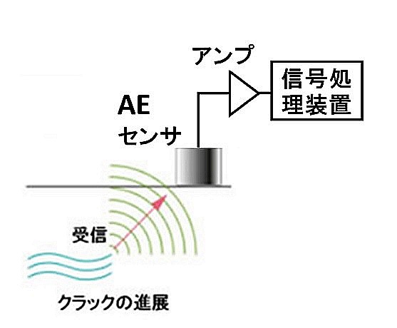 これに対し、AE計測は、物体の内部(材料中)に外力が負荷されている動的状態で、材料中のクラックが塑性変形あるいは破壊するときに発生する超音波(これをAE源という)が固体中を伝播する弾性波、即ちAE信号をAEセンサで受信する受動的(passive)計測方式である。