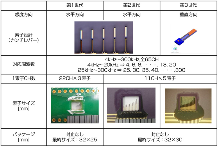 第1世代では22CHで、4kHz〜300kHzの周波数範囲を3つの素子で検出し、第2世代〜3世代では1素子22CHで、4kHz〜300kHzの周波数範囲を5つの素子で検出する。