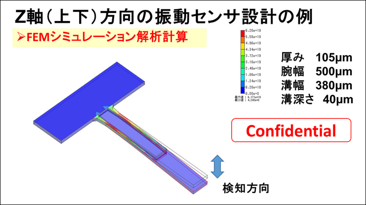 カンチレバーの左片端に固定条件の境界条件を適用している。FEMシミュレーション解析によって、共振時の変形や変位分布、応力分布などを解析結果として見ることができる。ここでは、振動FEMシミュレーション解析から、目的の検出周波数に対するカンチレバーの長さ、厚み、幅、溝幅、溝深さといった形状の最適な諸元を決定している。