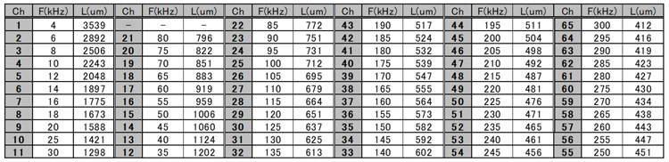 こうしたFEMシミュレーション解析によって、表1に示す第3世代のQDセンサ®の基本設計数値を求めてゆく。今回の第3世代のQDセンサ®のCH数は1から55までである。周波数はE12系列に従って、それぞれのカンチレバーの長さ(µm.1/1,000mm)を設計している。