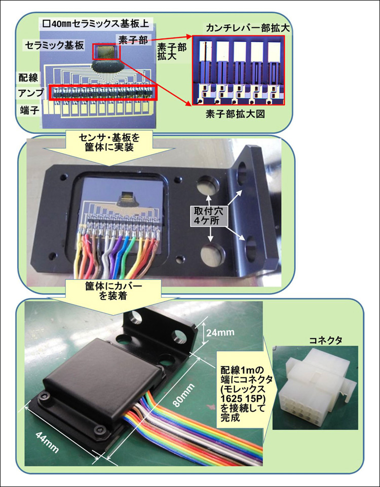 図3は、試作した第3世代QDセンサ®素子の筐体化を示す。まず、セラミック基板上に配線、端子がフォトエッチングされ、次に同基板上QDセンサ®素子とアンプが一体化して実装される。そして、第3世代QDセンサ®素子とアンプが実装されたセラミック基板を筐体に実装し、1つのセンサに10CHのカンチレバーが内蔵されたQDセンサ®として完成する。第3世代QDセンサ®内のカンチレバー10CH分の信号線とアンプ用電線およびアースの合計15本の信号線をはんだ付けし、他端をモレックスのコネクタで接続する。