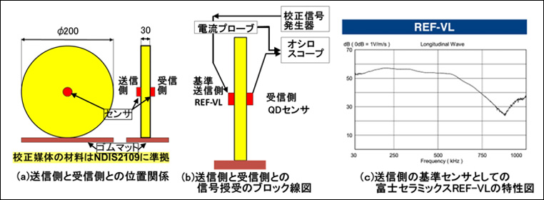 試作したQDセンサ®の校正は、日本非破壊検査協会規格(NDIS)2109「相互校正法によるアコースティック・エミッション(AE)変換子の絶対感度校正」方法に準拠して実施している。図4は、「相互校正法によるAE変換子の絶対感度校正方法」による本QDセンサ®の校正方法を示す。QDセンサ®(第3世代)の特性確認試験として、図4(a)に示すように、同等のセンサを媒体を介して同じ位置(中心)に対峙させて行う。校正媒体は、φ20cm×厚さ3cm、鉄鋼。基準センサは、 2個(リファレンス用AEセンサ)として、富士セラミックスREF-VLを使用。その特性は図4(c)に示す通りである。