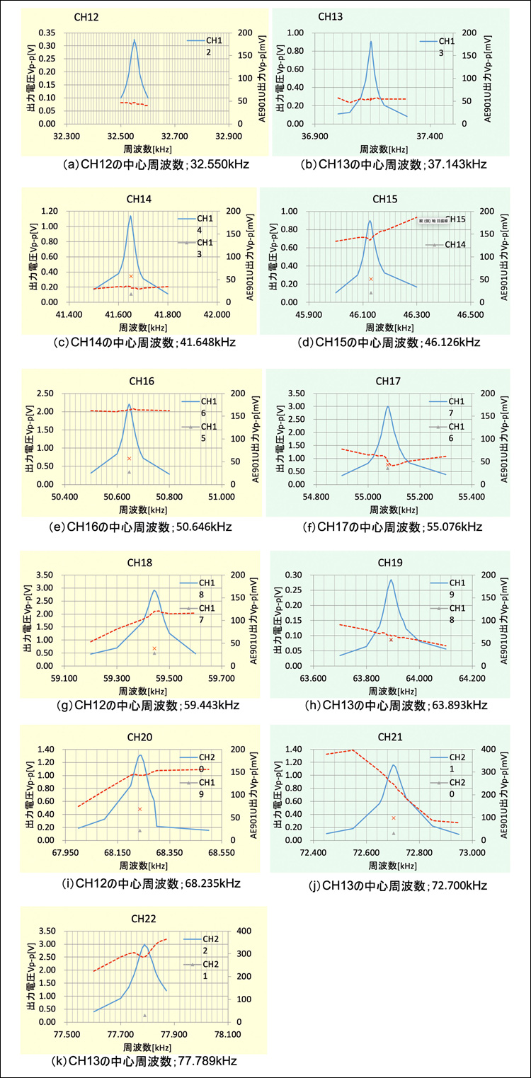 また、図12の図(a)から(k)までに示したように、QDセンサ®(第3世代)のCH12からCH22までの各チャンネルのピークは表4に示した中心周波数、Q値概算、半値幅、出力Vp-pに一致しており、ほぼ設計値通りにできていることがわかる。一方、NF設計回路社製AEセンサAE-901Uの波形は周波数特性図から共振周波数が70kHzとなっているが、図12(k)から共振のピークは77.95kHz以上にあるようである。