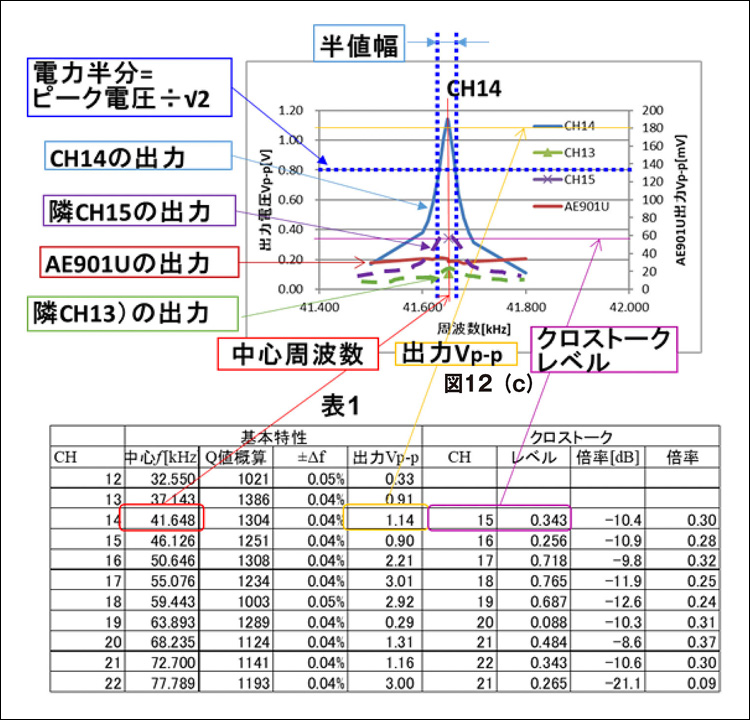 またここで、図13は、チャンネルCH14を例にとって、表4と図12(c)との関係、及び図12(c)の見方について示す。 まず、図13の上部図12(c)を見る。半値幅(±Δf)については、検出電力が中心周波数のピーク時の半分になる周波数の幅で、Ch14の場合では中心周波数41.648kHzの±0.04、つまり±1.66592kHzで、39.98208kHzから43.31392kHzまでの信号を検出するということで、検出精度を表すものと考えて良い。